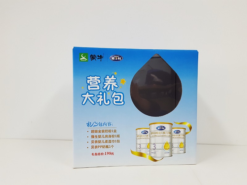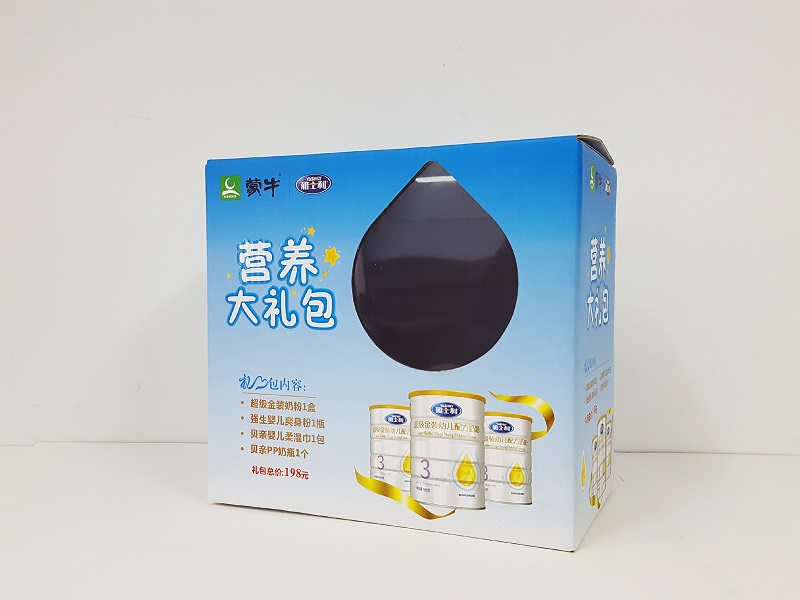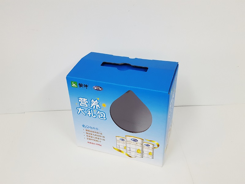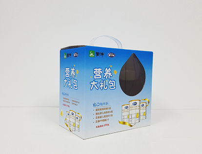 奶制品手提包装箱制作,手提包装箱制作1、材质:300克灰纸裱E瓦;2、工艺:印刷、亮膜