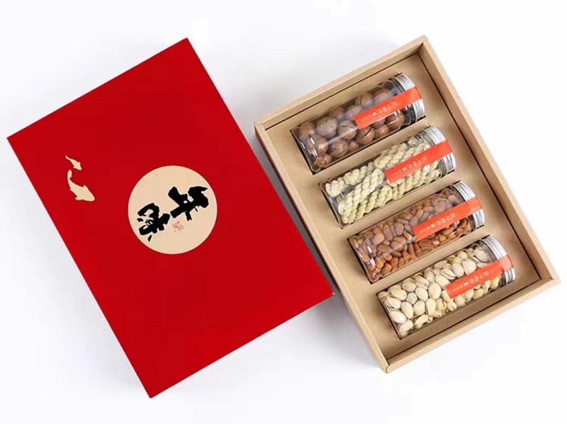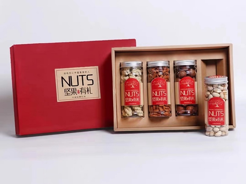 其次,食品礼品盒制作厂材料选择应符合坚果食品的特点,以确保产品的保护和保存,保持坚果的天然香味和美味口感,同时具有一定的耐用性和抗压性能。坚果礼盒不仅仅是为了方便运输和储存,也是一种表现对消费者品质承诺的方式。因此,在坚果包装盒制作过程中,注意细节和品质,追求完美的效果,包装盒材料的使用应能够满足品牌形象和市场需求。